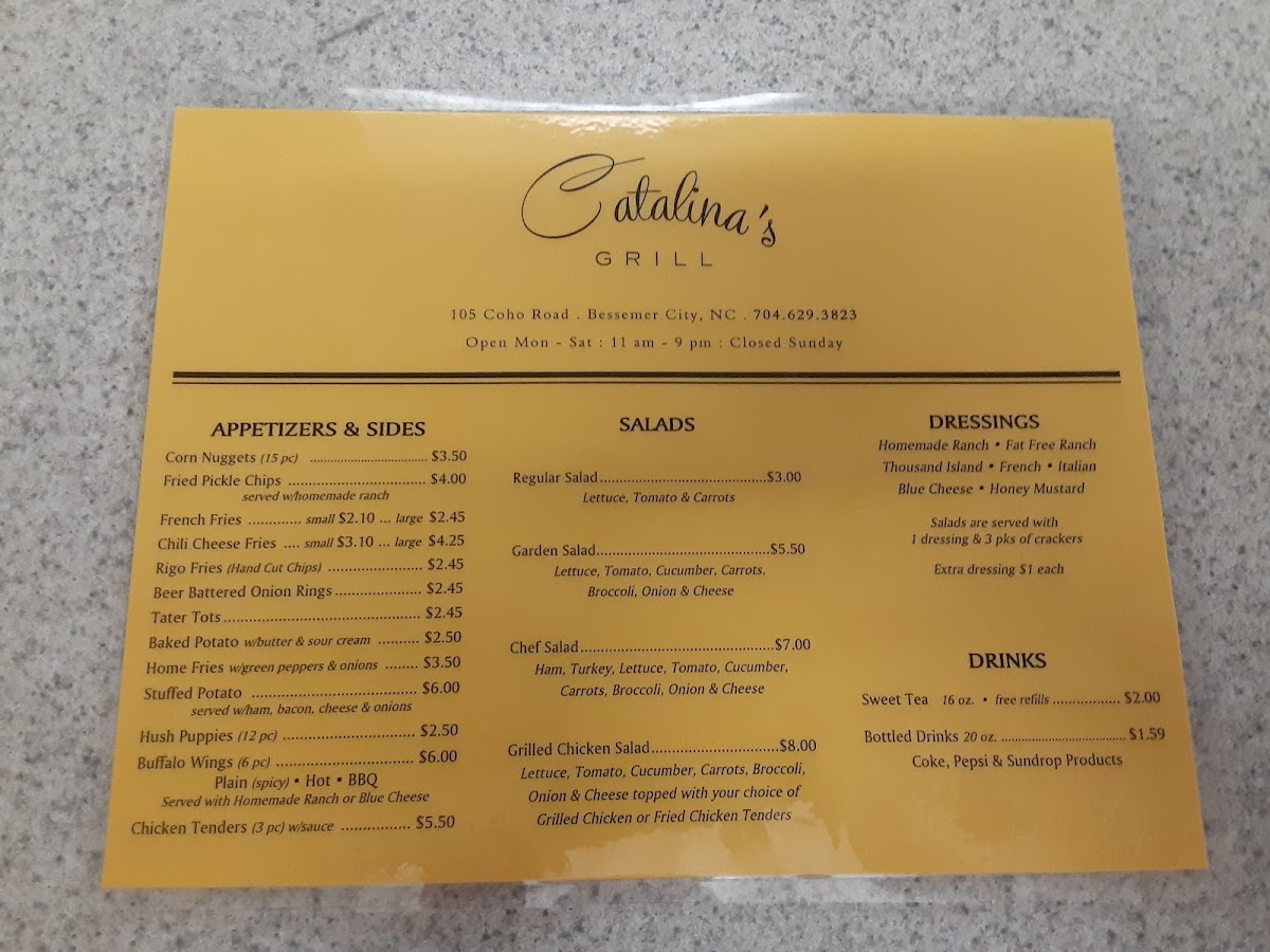 Welcome to Catalina Grill, located at 6710 Dallas Cherryville Hwy in Bessemer City, NC. This gem may be tucked inside a gas station, but don’t let that fool you; the menu here is bursting with flavor and value. Customers rave about the freshly cooked food, including favorites like the Buffalo Chicken Sandwich and mouthwatering cheeseburgers. Portions are generous, ensuring you leave satisfied without breaking the bank.